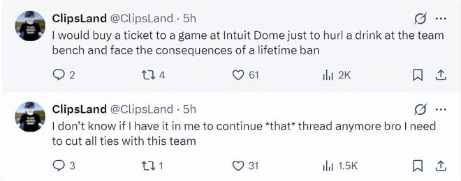快船的粉头子,也是死忠粉ClipsLand在这场比赛后都绝望了,他写道:我愿买票去Intuit球馆看球,就为了朝球队替补席泼杯饮料,然后坦然接受终身禁赛的后果。我不知道我是否该继续支持快船,我感觉我应该跟这支球队断绝关系了。