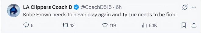 快船媒体LA Clippers Coach D写道:科比-布朗根本就不该获得登场机会,快船应该解雇泰伦卢。