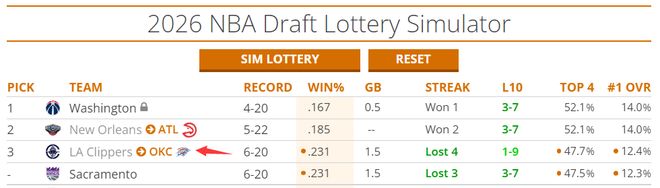 快船队的状元签概率已经提升到12.4%,前四顺位概率高达47.7%,这两项都是联盟第三高的,因为快船的战绩是联盟倒数第三,很惨烈的是2026年快船首轮签在雷霆,换言之明年夏天雷霆还可能得到一个状元,讽刺吧?