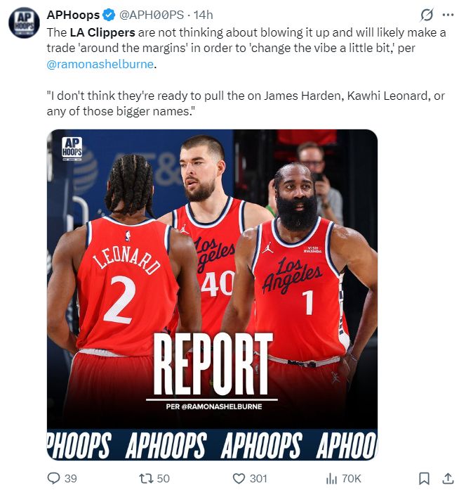 赛后,洛杉矶记者蕾梦娜-谢尔伯恩透露,快船本赛季不太可能交易哈登、伦纳德,球队致力于小修补阵容改变更衣室的情况。(结果快船就用这场比赛打了她的脸,就这更衣室情况能改善?)