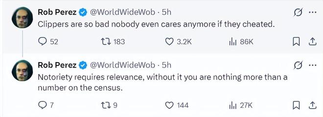 美记Rob Perez写道:快船真的烂透了,已经烂到没有人讨论他们是否违规还是作弊,原本获得正向的声望就必须取得胜利,但这支快船却反其道而行之。